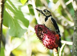もう一つの注目がアカゲラ。ホオノキの実に来るというので待ちましたが、金曜日はアオゲラ、コゲラだけで見られず。土曜日にようやく見られました(写真)。こちらは9年振り。黒と白、赤というコントラスはやはり存在感があります。