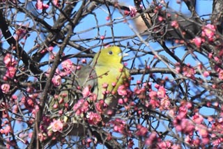 池渕史跡公園などを回ってから、もう一度梅林へ。いました、アオバト。ただ、もっとも大きなウメの木の込み入ったところにいて、顔もよく分からない状態。それでも粘っているとようやく動き出して、ウメの花を食べ始め。おそらく花を咥えて、蜜を絞って食べていると思われます。アオバトは果実食で甘党。樹幹で採餌するので緑色の体が保護色。ウメの桃色に映えて美しい。私のニューイヤーバードはアオバトでした。