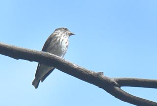 今日も石神井公園へ。やはり梅林の近くに人が集まっています。少し待っているとエゾビタキ(写真)の上に登場。しきりにキャッチ&フライを繰り返して虫を捕まえている様子。エゾビタキはキビタキなどと同じ仲間で、春に北へ渡り秋には東南アジアに渡ります。春の渡りでは日本海側のルートをとるようで、東京では秋によく見られます。ほかにキビタキの♀タイプも見ました。コサメビタキもいたようですが、こちらは見えず。近くではアオゲラも見られました。