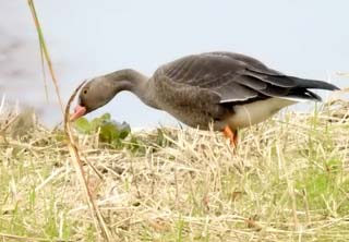 石神井公園で顔見知りの方から、荒川の水域でカリガネが見られると聞いて探しに行ってきました。現地ではすでに多くの人が集まっていて、場所も分かったのですが、岸からは見えないところに隠れるようにいてなかなか見られません。それでもしばらく待っていると何と岸の土手の草地に出てきて、じっくり観察できました(写真)。土手に生えている草の実などをついばんでいるようです。