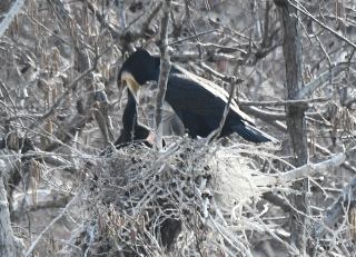 池ではヒドリガモやオナガガモがのんびり。気になっているカワウの巣を見ると一番高いところの巣で、給餌をしていました(写真)。雛が親鳥の喉まで首を突っ込んで、餌をもらっているようでした。おそらく親鳥の体の中で半分消化した状態の餌を吐き戻して与えているのでは。それは別として、カワウの営巣したハンノキは糞で真っ白になって枯れかかっているようでした。中之島の天然記念物の沼沢植物群落への影響が心配されます。