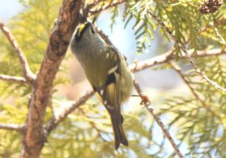 三宝寺池川に入ってすぐ、セグロセキレイの声。水辺観察園の春の花園で節分草を見て、進むとエナガの群れと遭遇、シジュウカラ、メジロ、コゲラも混じっているカラの混群。さらに、キクイタダキ(写真)も2羽いました。サワラの枝のなかで動き回っているのでなかなか思うように見られませんが、それでも頭の上の黄色い冠羽を何とかとらえられました。