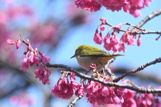 サクラの様子はどうかと、B地区野球場に行ってみました。カンザクラ、オオカンザクラはすでに咲き、今はカンヒザクラが咲き誇っていました。そこに蜜を求めてメジロの群れがひっきりなしに(写真)。甘党のメジロには願ってもないごちそう。