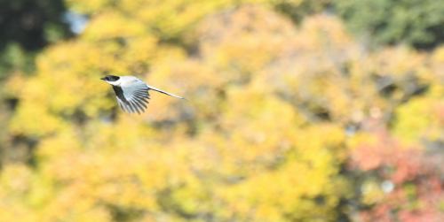 暑かった10月から、急に冷え込んできて晩秋の趣。紅葉は、例年なら早くに紅葉するサクラもまだ残って、ケヤキやシデ、カツラなど雑木林、さらにイチョウの黄葉、イロハモミジも色付きだして、華やかな秋色に染まっています。そんな景色の中をオナガが飛んでいました(写真)。
