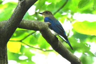 再び戻ると、少し東側でオオルリの♂若鳥を見られました(写真)。背中だけが青くて頭は茶色という、なんだか変な印象ですが、来年には立派な姿になるはず。オオルリは帰りの渡りも早いので、政調は先に渡っているのでしょう。エゾビタキも情報がありましたが見られず。これからの楽しみとなりました。