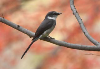 池の南側を歩いていると、カラの混群に出会って、中にキクイタダキもいるらしい。エナガ、シジュウカラ、コゲラ、メジロの大きな群れ。キクイタダキを必死に探しているうちに、リュウキュウサンショウクイが現れました。紅葉を背景になかなかいい景色です(写真)。キクイタダキは次回の楽しみということで、アトリを見てから帰ることにしました。