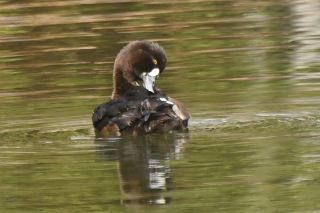 今シーズン最後の水鳥調査を行いました。結果、カモ類は8種類、138羽で大きく減っていました。内訳は、マガモ10羽、カルガモ71羽、コガモ11羽、オカヨシガモ3羽、ヒドリガモ9羽、キンクロハジロ32羽、ホシハジロ1羽、スズガモ1羽(写真)でした。