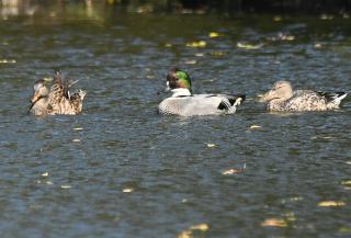 次第に晴れてくるとの予報を信じて出かけたら、途中でたびたび雨に見舞われた。カモが次第に増えてきて、これまでのコガモ、オナガガモに加えて、今日はマガモ(写真)、キンクロハジロが見られた。